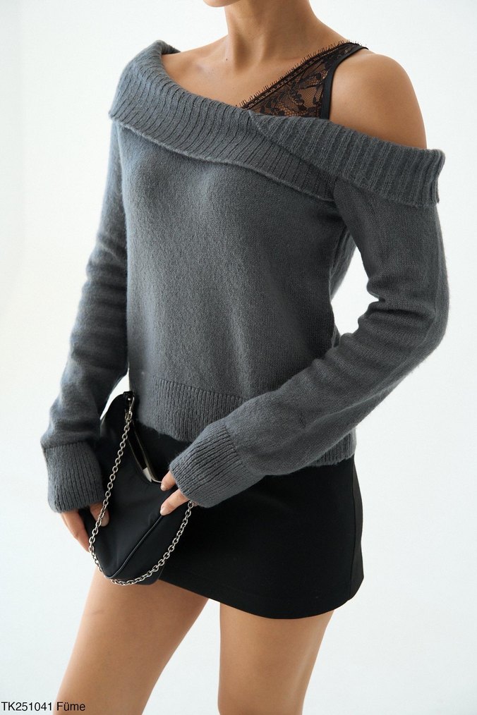 Antrasit Dantel Detaylı Omzu Açık Triko Kazak
