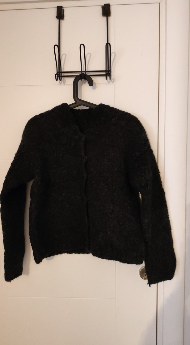 Siyah renkli, örgüyünden yapılmış, uzun kollu, bisiklet yakalı ve bol kesim kadın hırka/ceket (el örgüsüdür)