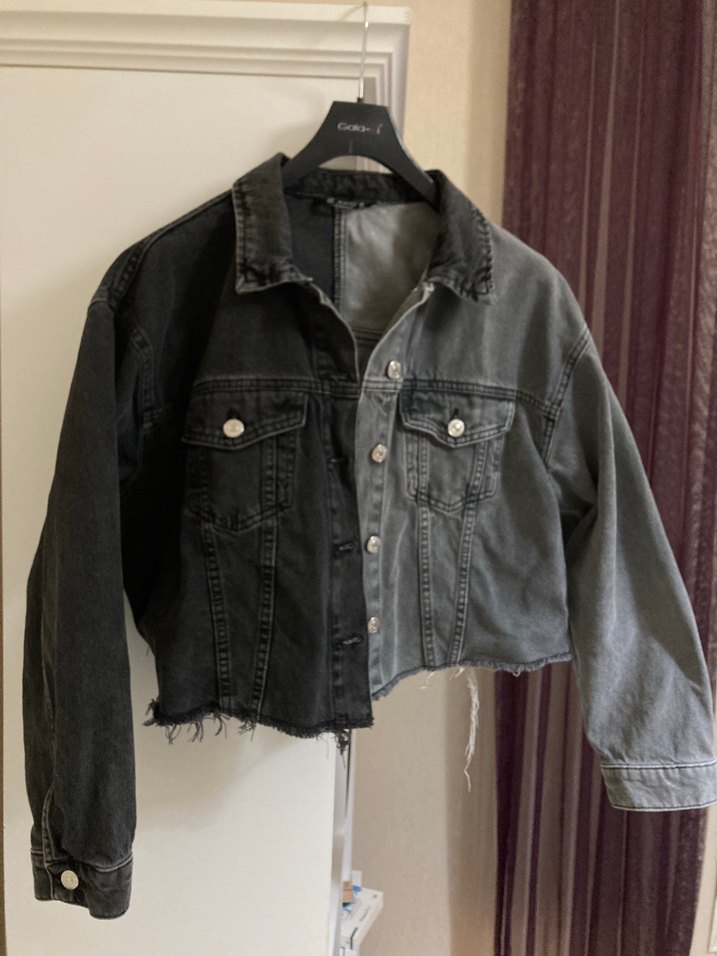 Gri tonlarında, düğmeli ve uzun kollu kısa bel boy, loose fit kadın denim ceket. Rahat sokak stili için ideal. Çok kullanılmadı.