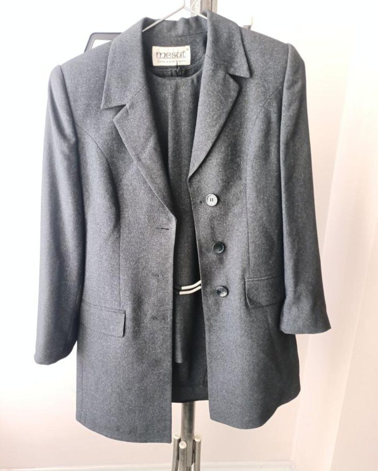 Gri renkte, yün kumaştan üretilmiş, düğmeli ve uzun kollu kadın blazer ceket. Normal kesim ve midi boyda, ofis için klasik şıklık sunar. S/36 BEDEN CEKET-YELEK-PANTOLON TAKIM ANTRASİT GRİ RENK DEFO VS.YOK