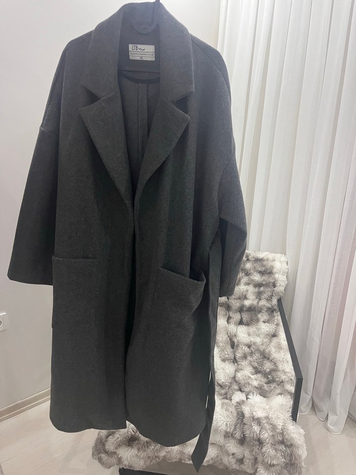 Kadınlar için uzun, bol kesim antrasit gri kaban. Geniş yaka, büyük ön cepler ve bel ayarı için kemer içerir. Yumuşak ve sıcak kumaş.