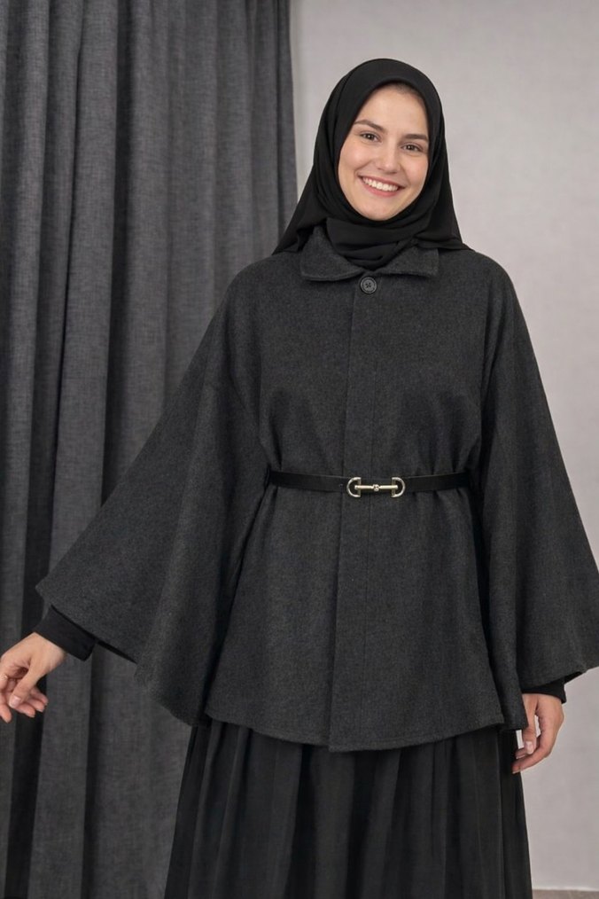 Yüksek yakalı, uzun kollu ve bol kesim kadın panço. Kemerli ve midi boyda, koyu gri renkte. Yumuşak ve sıcak kumaştan, günlük kullanıma uygun.