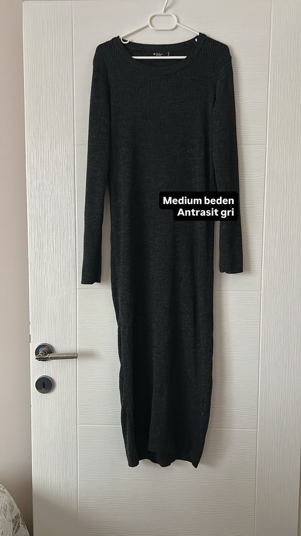 Antrasit gri tonlarında, uzun kollu ve tek renk yün kumaştan, tekne yaka midi boy, vücuda oturan elbise. Günlük kullanıma uygun, rahat ve şık.