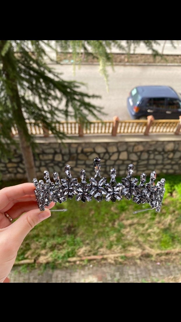 Gri cam taşlarla süslenmiş, gotik tarzda klasik zarafet sunan parlak taşlı saç aksesuarı.