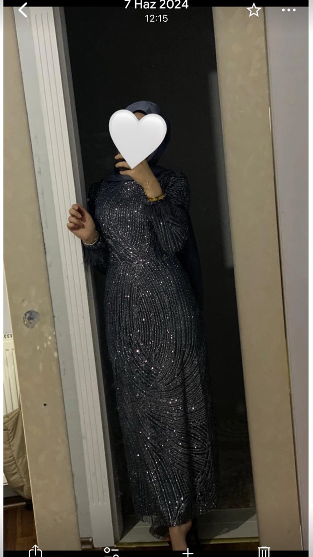 Antrasit gri, uzun kollu simli bir abiyedir.Ürün sadece 1 kez söz için giyinildi hiçbir kusur yoktur.