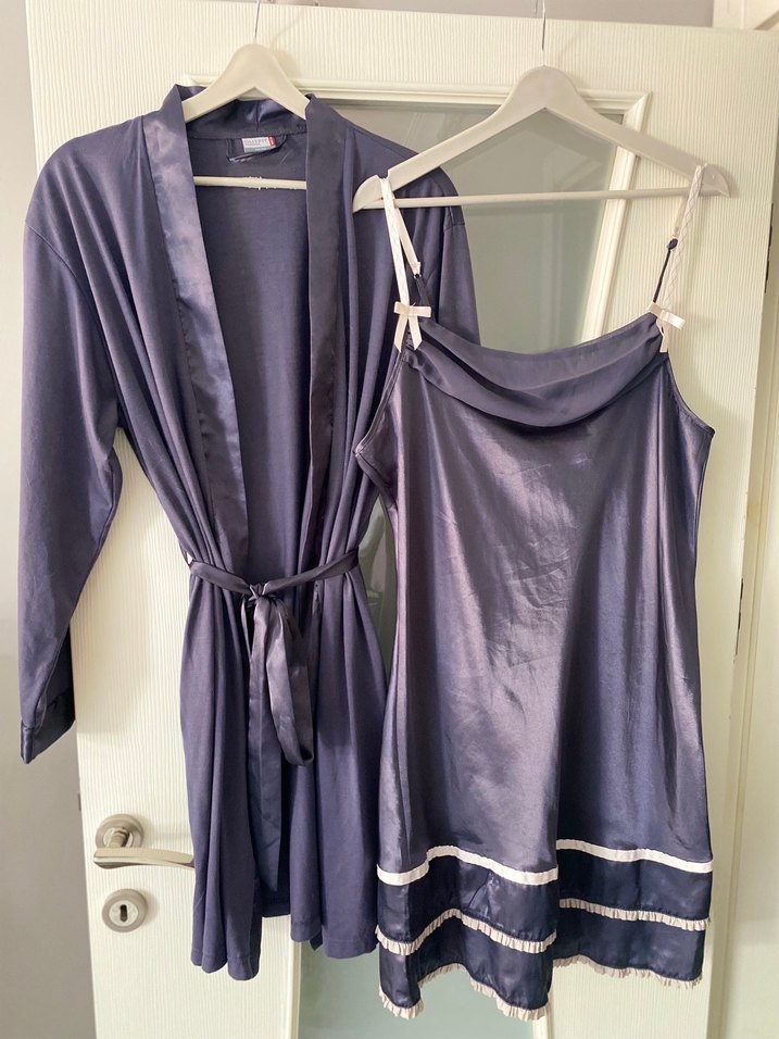 Antrasit, ip askılı midi gecelik ve kuşaklı, uzun kollu sabahlıktan oluşan rahat bir takım. Geceliğin etek kısmında ince süslemeler vardır. Gecelik satendir, sabahlığın kol uçlarında ve kuşağında zaten detayı vardır. Yurtdışından alında