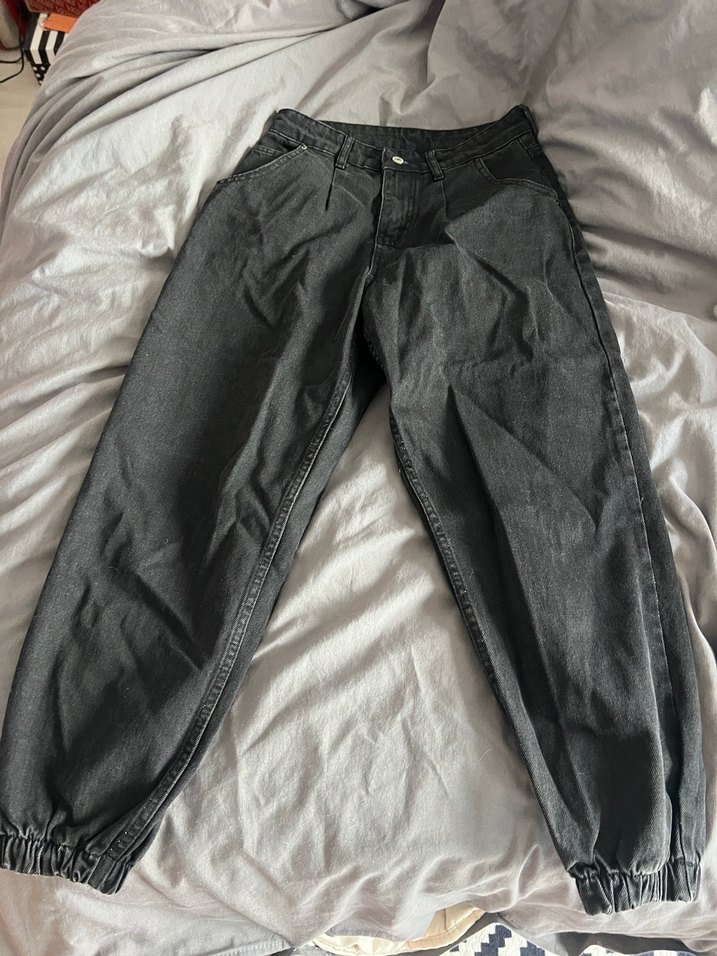 Beli kemerli, lastikli paçalı gri bol kesim denim kot pantolon, günlük rahat kullanım için uygundur.
