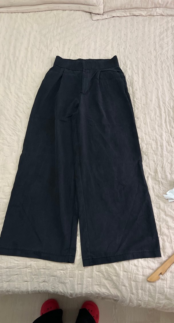Lacivert keten kumaştan, bol kesim ve midi boyda, minimalist normcore tarzında rahat ve şık kadın pantolonu.