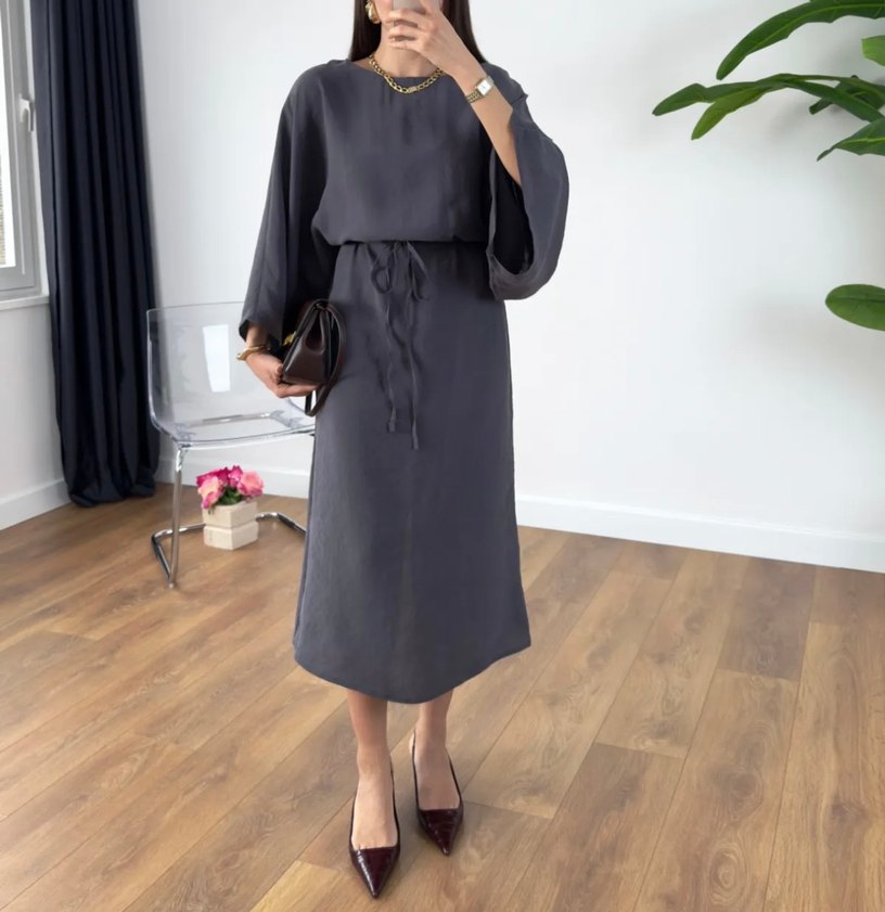Antrasit uzun elbise, bol kesim, kayık yaka ve uzun kolludur. Belde kemer detayıyla ofis için uygundur. ✨hiç giymedim
