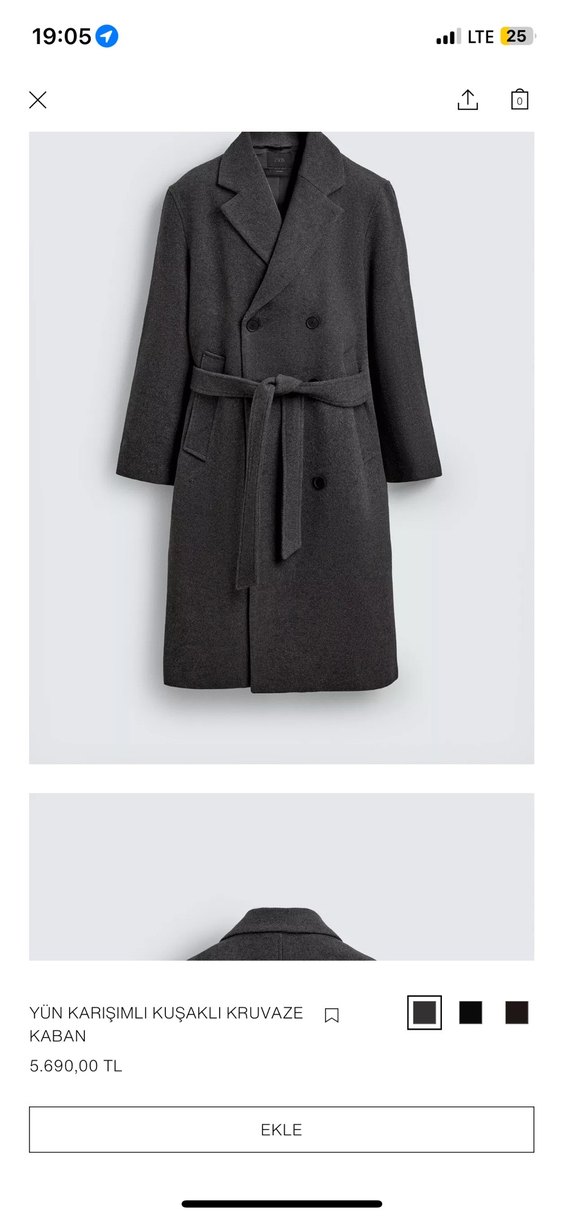 Çift düğmeli, antrasit renkli uzun kaban. Kuşaklı ve yan ceplidir. Klasik yaka detayına sahiptir. ️