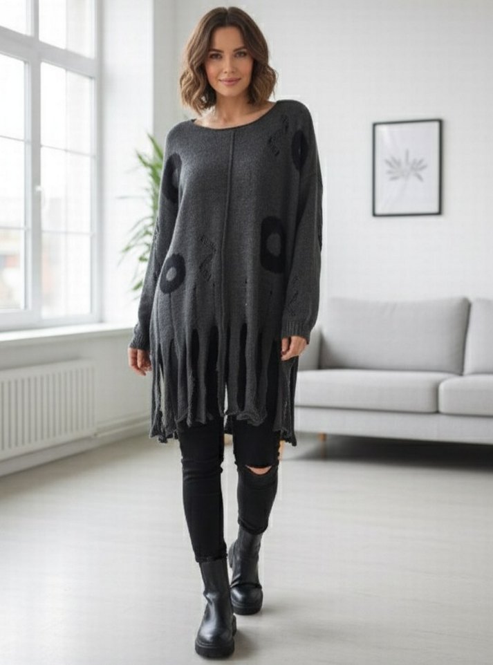 Grunge tarzında, şerit püsküllü, siyah halka desenli, salaş kazak. En 61cm boy 87cm Her bedene olur.