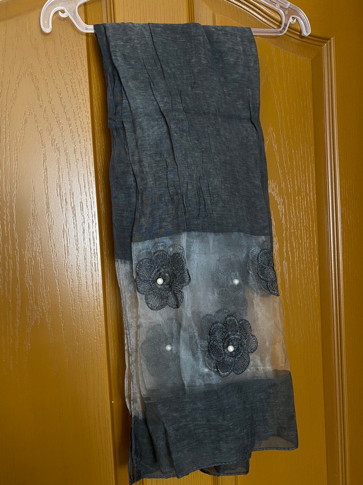 Antrasit renkte, inci ve çiçek detaylı şal