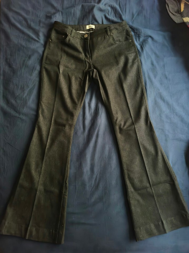 Antrasit/siyah renkte, kemerli kadın denim pantolon. Normal boy ve regular fit kesimiyle günlük kullanıma uygun sade bir tasarım sunar. Üst kısmı bacağa oturur, paçaları hafif geniş flare modeli gibidir. 38 bedendir. Bacak boyu 100 cmdir. Sorunsuzdur. İadesi yoktur.
