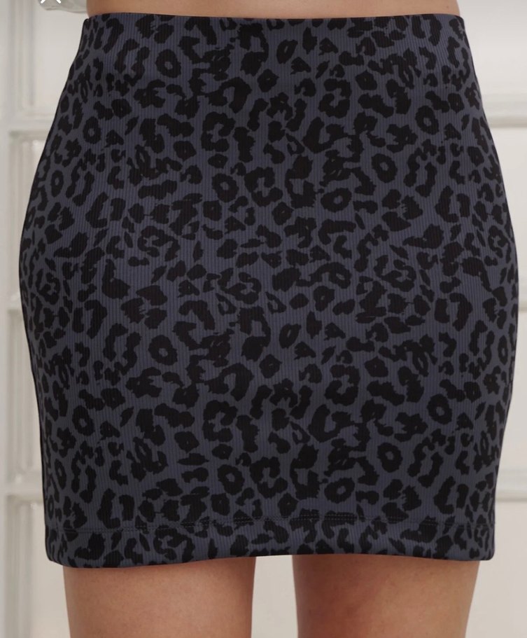Sentetik kumaştan, gri leopar desenli ve likralı mini etek. Sokak stiline uygun, dış mekan kullanımı için ideal.