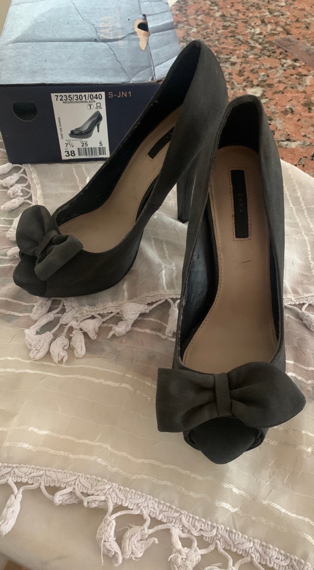 Koyu gri süet malzemeden, yüksek topuklu ve fiyonk detaylı stiletto. Romantik akşamlar için klasik şıklık sunar. Zaradan 38 no 13 cm topuklu kutulu