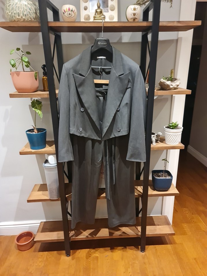 Hic kullanilmadi. Bayilarak almistim ancak kilo verdigim icin giyemedim. Ceket kirlangic yaka, vatkali oversize durusu var. Pantolon dokumlu ve baglama detayi var. Rahat bir model. Kumasin kalitesinin gorsellerden belli oldugunu dusunuyorum Fk.pynapple ureticisi. kumas dikim dugmeler hersey ust kalite. Ayri ayri satmiyorum M beden 38e tam olacaktir. Ofis ve sokak stiline uygun.