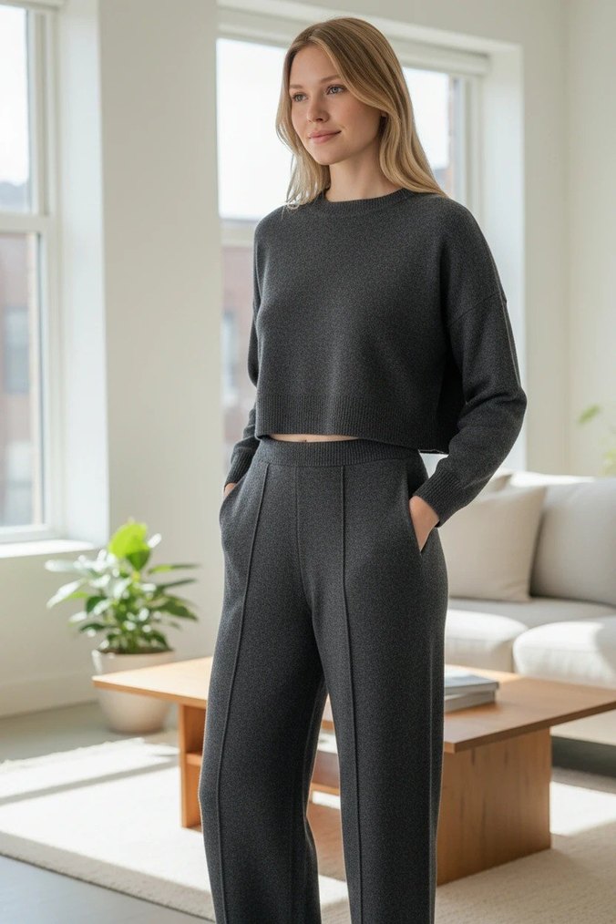 Antrasit Triko Takım - Crop Kazak & Yüksek Bel İspanyol PaçaPant