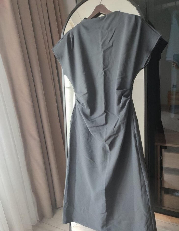 Antrasit renkte, V yaka ve kolsuz, drapeli tasarımı ve midi boy uzunluğuyla ofis için uygundur.
