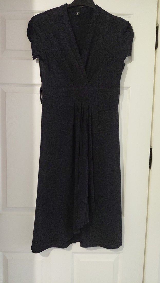 Antrasit drapeli ve V yaka olan bu triko elbise kısa kollu olup vücuda oturan kesimdedir. Ofis için uygun, sade ve şık bir görünüme sahiptir.