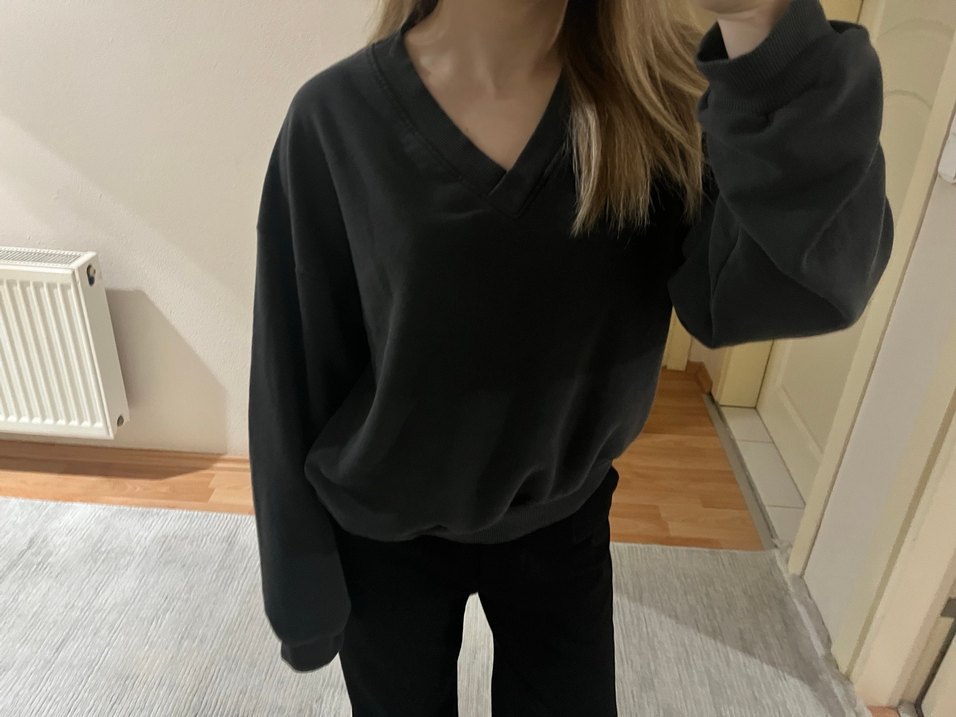 Bu antrasit sweatshirt, V yaka ve rahat kesime sahip, yumuşak keten kumaştan üretilmiştir. Normal midi boyda ve uzun kolludur, günlük rahat kullanım için uygundur.