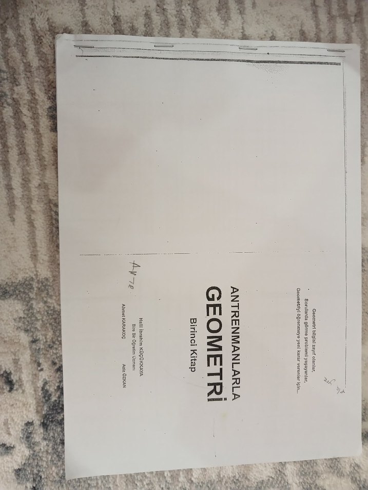 ilk on sayfa çözülü Geometri üzerine hazırlık ve alıştırmalar içeren Antrenmanlarla Geometri Birinci Kitap. Sınavlara yönelik çalışma kitabı.