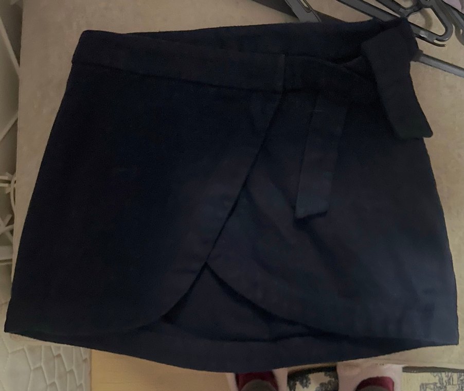 Anvelop detaylara sahip, vücuda oturan lacivert mini etek. Soğuk havalar için uygun. İçinde şortu yok