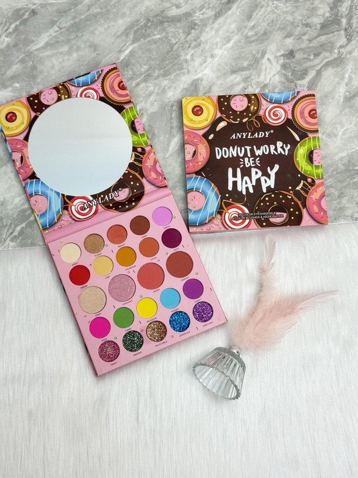 ANYLADY marka far paleti, mat ve ışıltılı çok renkli tonlar içerir. Aynalı ve renkli donut temalı kutusuyla dikkat çeker.