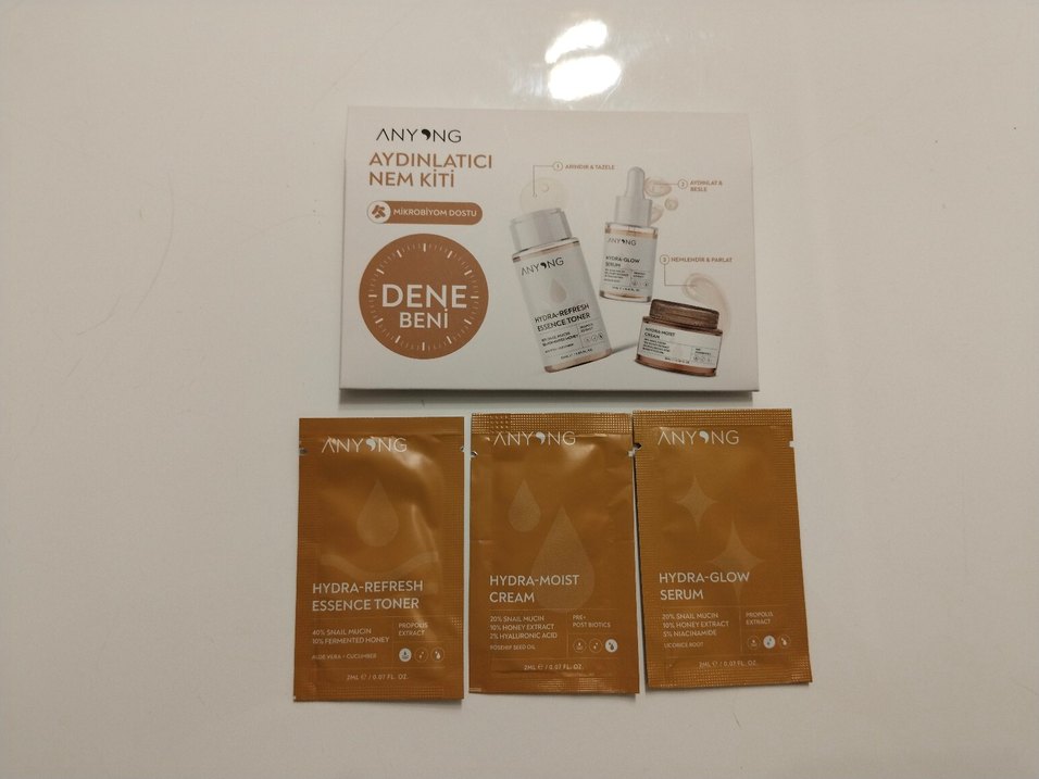 Anysng nem seti, cildi nemlendiren ve aydınlatan Hydra-Refresh Tonik, Hydra-Moist Krem ve Hydra-Glow Serum içerir. 3 lü tester setidir. #tester #anyong #anyongtester