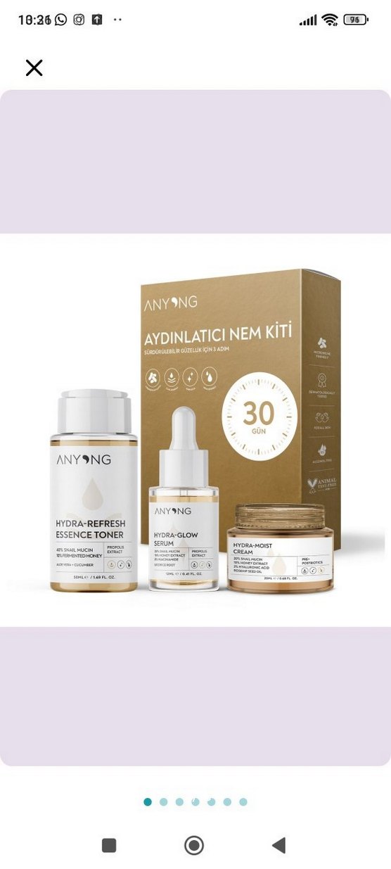 Anyong Aydınlatıcı Nem Kiti, 30 gün kullanıma uygun, nemlendirici tonik, ışık veren serum ve nemlendirici krem içerir. Çok az kullandım miktarları gözüküyor.