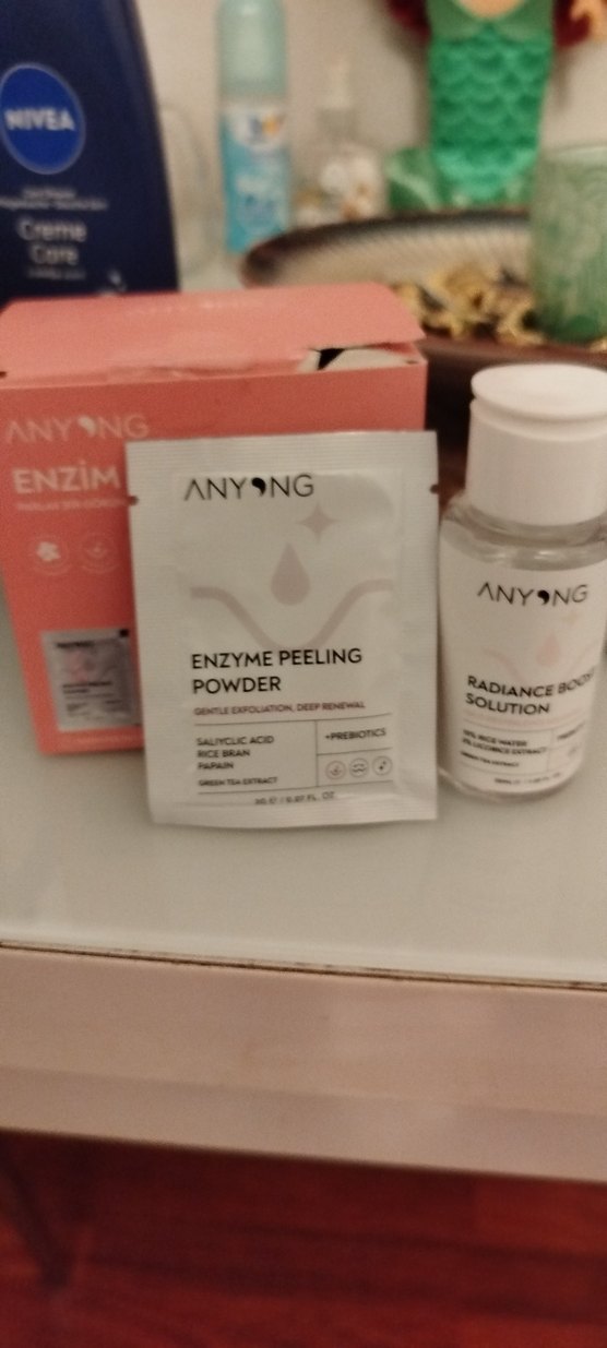 Anyong enzim peeling tozu ve parlaklık artırıcı çözüm içeren set, nazik eksfoliasyon ve cilt yenileme sağlar. 14 şase var. 1 sasesini ve iki damla solusyon kullandim. Elimde çok enzim peeling olduğundan satıyorum.