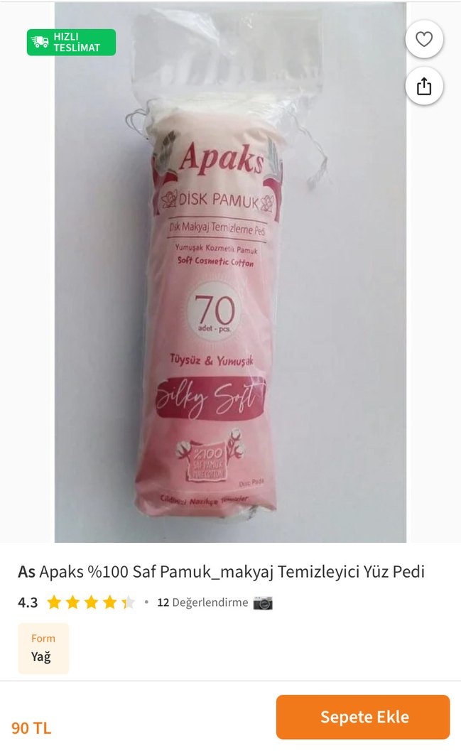 Apaks %100 saf pamuktan üretilmiş 70 adet makyaj temizleyici yüz pedi. Yumuşak ve tüysüz dokusu ile cildi nazikçe temizler. ( elimde 10 paket var)