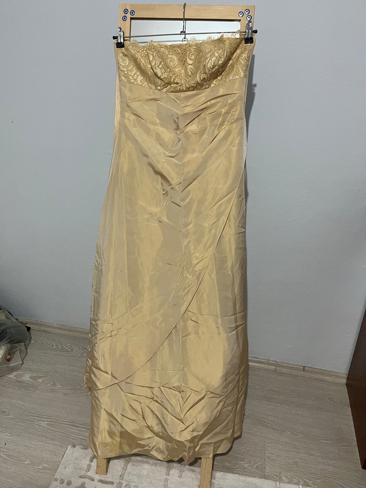 Drapeli, straplez ve uzun kesimli bu elbise parlak bej renkte, vintage ve bohem tarzıyla düğünler için uygun klasik bir şıklıktadır. Straplez boy uzunluğu 124cm bel genişliği 70cm