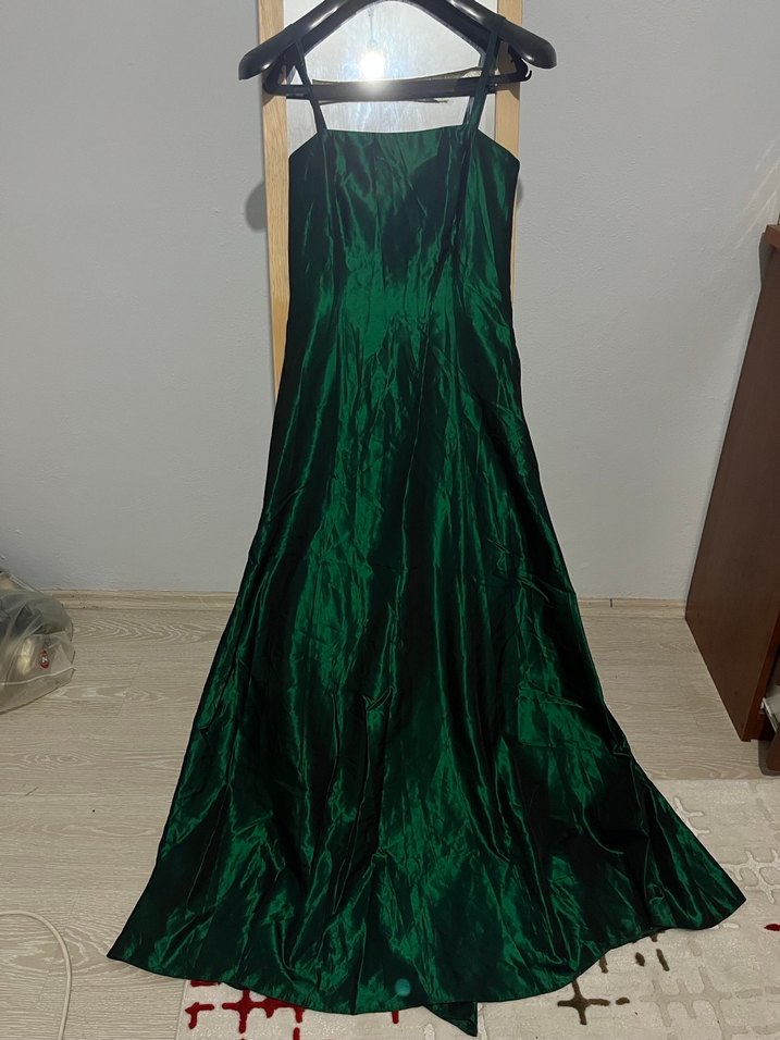 Uzun, yeşil ince askılı abiye elbise, drapeli ve vücuda oturan kesimli sırt dekolteli Boy askı ucundan etek ucuna 154cm bel genişliği 74cm