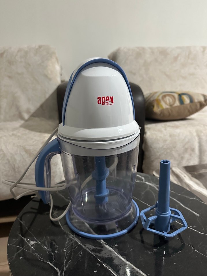 Apex markalı mavi saplı ve tabanlı, şeffaf hazneli blender ve doğrayıcı. Ekstra mavi aparatla çok yönlü kullanım sağlar. Üstten basmanlı üstten sert sağlı sollu basmanız lazım bozuk diye geri yollamayın ona göre alın