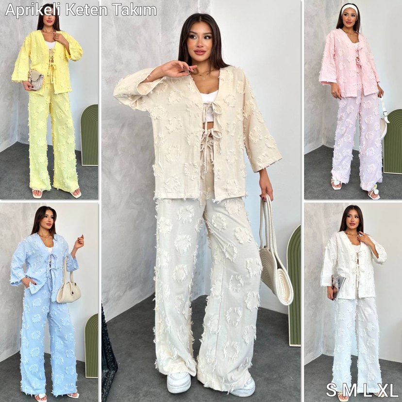 Aplikeli keten kumaştan üretilmiş kimono takım salaş bir kesime sahiptir. 4 renk seçeneği mavi, pembe ,bej sarı