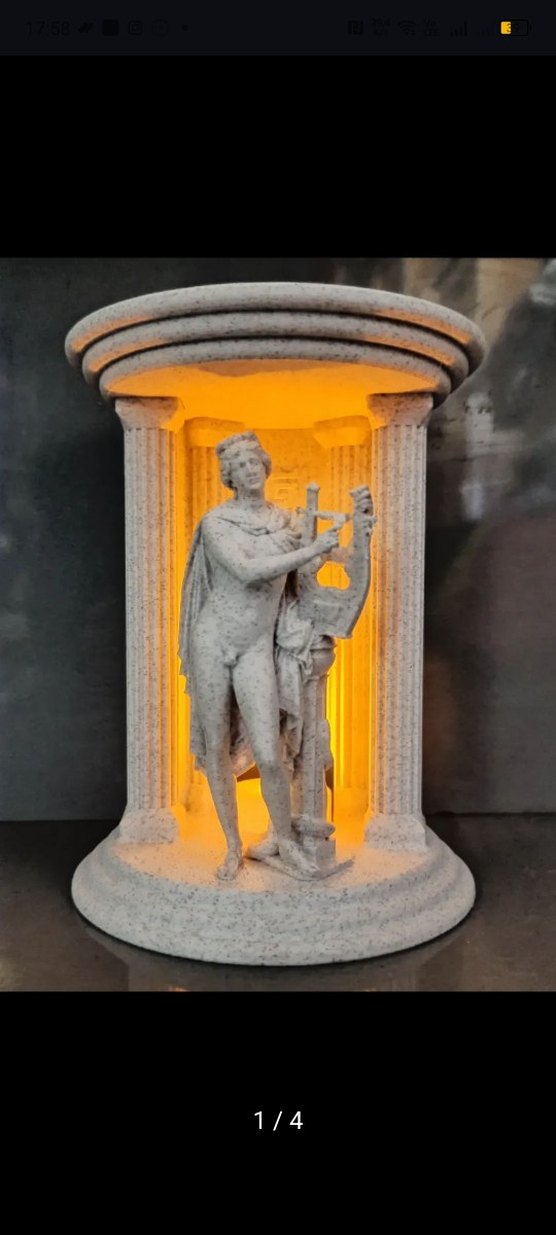 Altın ışıkla aydınlatılan klasik heykel figürlü dekoratif yuvarlak sütun yapısı. ️