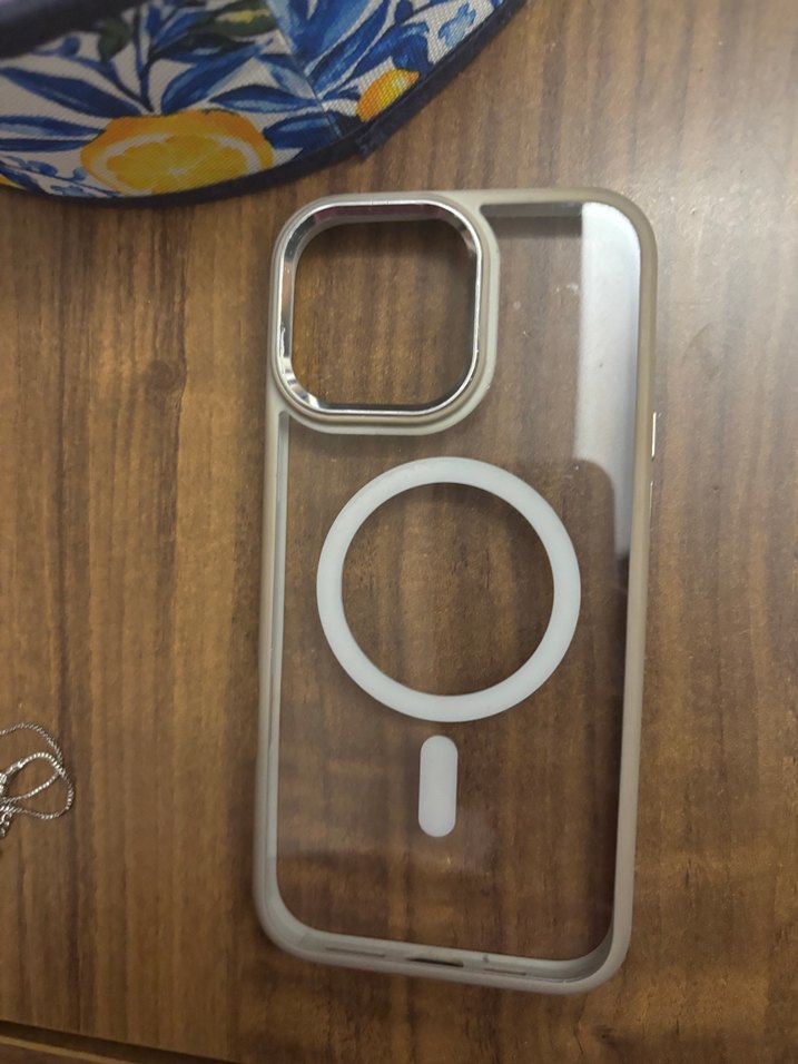 Bej renkli, düğmeli ve bohem tarzda telefon kılıfı. Şeffaf arka yüzeyi ve gri kenarları ile koruma sağlar.