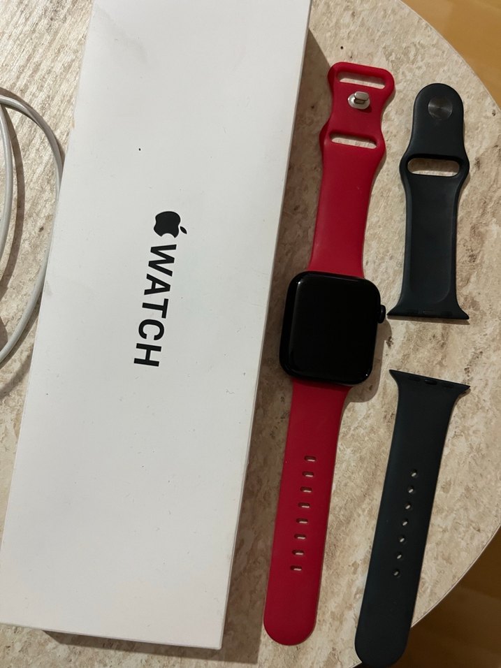Koyu ekranlı akıllı saat, orijinal kayışı koyu olan kırmızı kayış ile birlikte gönderilecek. Hiçbir çizik vs yok kutusu şarjı her şeyi mevcut. Bir sene olmadı alalı, yeni diyebilirim. Se gen2 44 mm