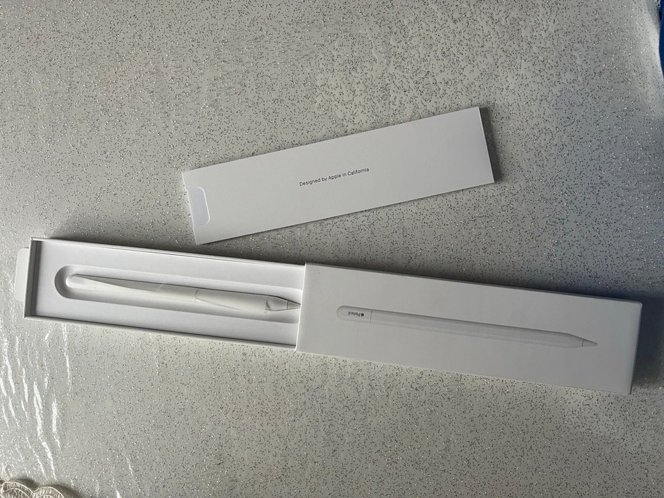 Apple tablet için beyaz kalem, şık tasarımlı ve ince kutuda paketlenmiş. Hassas kullanım sağlar. ✍️