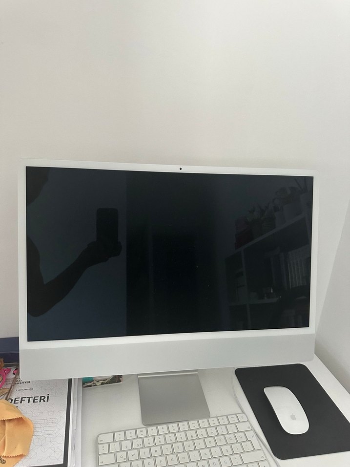 Üst orta kısmında dahili web kamerası bulunan beyaz bilgisaya monitörü, klavye ve fare ile birlikte kullanıma hazır. Ürün yenidir faturalıdır