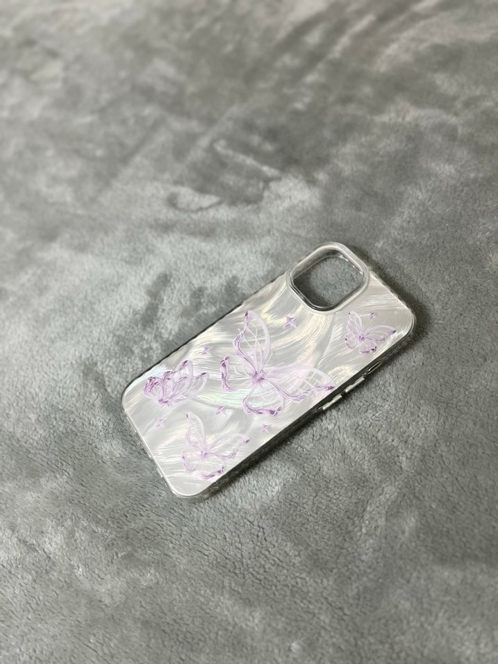 Gri zemin üzerinde mor kelebek desenli, parlak yüzeye sahip bohem tarzda telefon kılıfı. #telefon # kılıf #ıphone