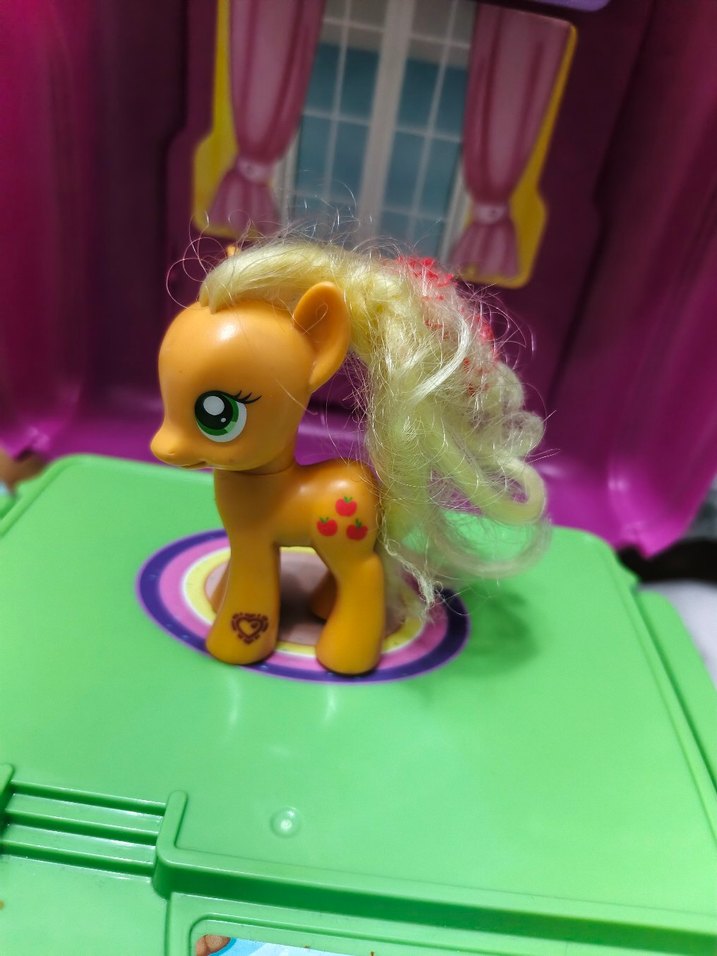 Kıvırcık sarı saçlı, üzerinde belirgin işaretler bulunan renkli sarı My Little Pony figürü.