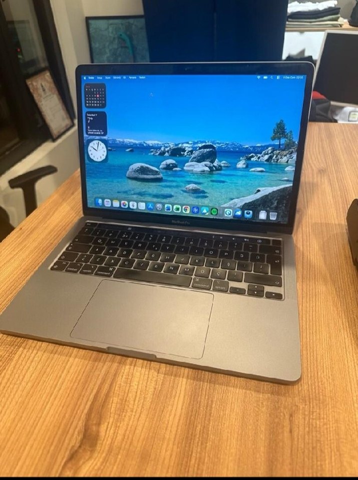 Ahşap yüzeyde duran, doğal manzaralı ekranı ve tam klavyesi olan gri renkli laptop.