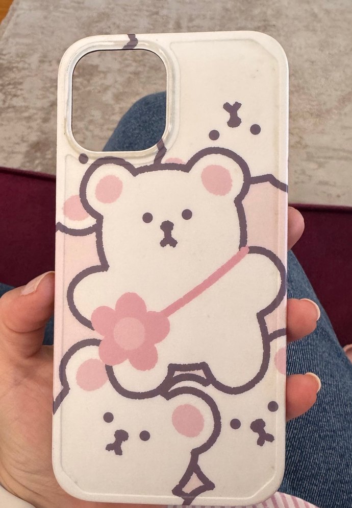 Apple marka, pastel pembe renkli, dantel detaylı ve sevimli ayıcık desenli telefon kılıfı, normcore tarzında.