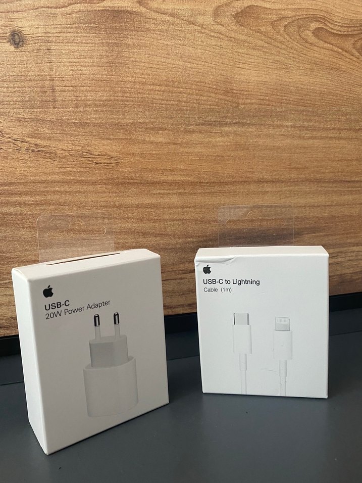 Apple USB-C 20W güç adaptörü ve 1 metre uzunluğunda USB-C'den Lightning kablosu. Hızlı şarj destekler.