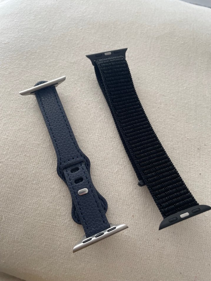 Birisi dokulu deri, diğeri dokuma kumaş tasarımlı, metal bağlantılı iki siyah akıllı saat kayışı seti.⌚