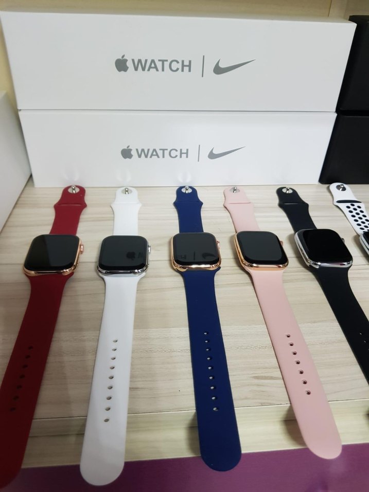 Apple Watch Nike çok renkli kayışlara sahip akıllı saatler. Kırmızı, beyaz, mavi, pembe, siyah ve delikli beyaz seçenekleri mevcut. Kare ekranlı ve sportif tasarımda.