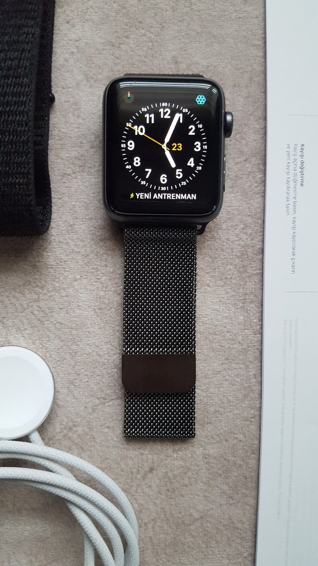 Merhabalar, Apple Watch Series 3 42mm uzay grisi rengindedir. Pil seviyesi %97 olup çok çok az kullanılmıştır. Bir iki kılcal çiziği harici çok temizdir. Üzerindeki zincir kordonu sıfırdır. Yanında kendi kutusu, kendi orijinal kordonu, 2 adet sıfır kordon, 1 adet kumaş kordon, orijinal şarj aletiyle gönderilecektir. Fiyat kesintiden dolayı maalesef sondur. Alana hayırlı olsun.