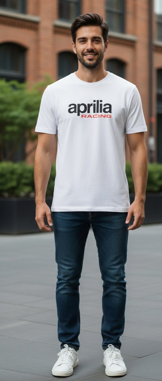 Beyaz renkli, kısa kollu, crew neck erkek tişörtü. 'aprilia RACING' baskılı, denim görünümlü kumaştan, rahat kesim, günlük dış mekan kullanımı için uygundur. ️