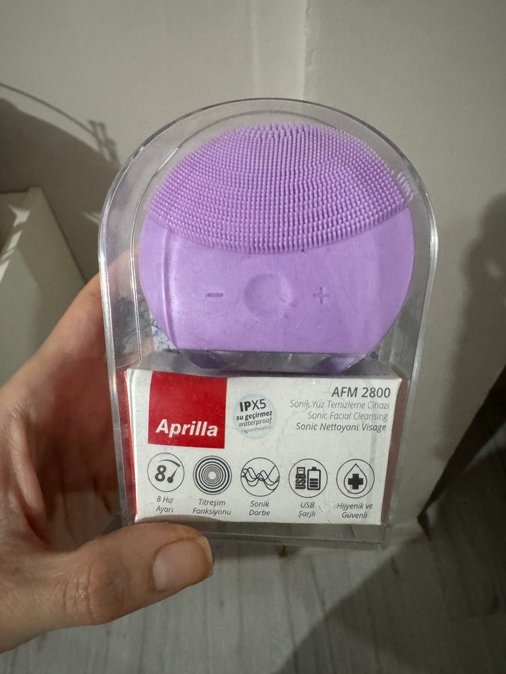 Aprilla AFM2800, pastel mor renkte, IPX5 su geçirmezlik, 8 titreşim modu, sonic darbeler ve USB şarj özellikli yüz temizleme cihazıdır.